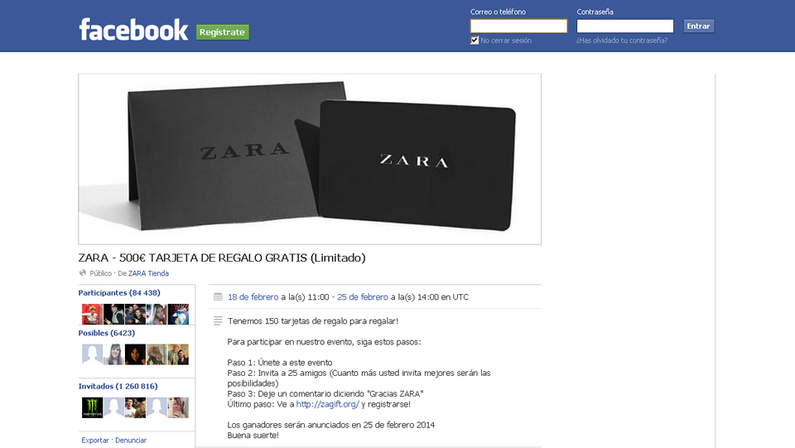 Tarjetas de regalo de 500 euros para gastar en Zara; ese es el prometedor regalo con el que muchos se encontraron estos días al abrir su Facebook. Un peculiar evento en la red social prometía 150 tarjetas para aquellos que siguieran unos sencillos pasos: invitar a 25 amigos, dejar un comentario con las palabras «Gracias Zara» y registrarse en una sospechosa página web.